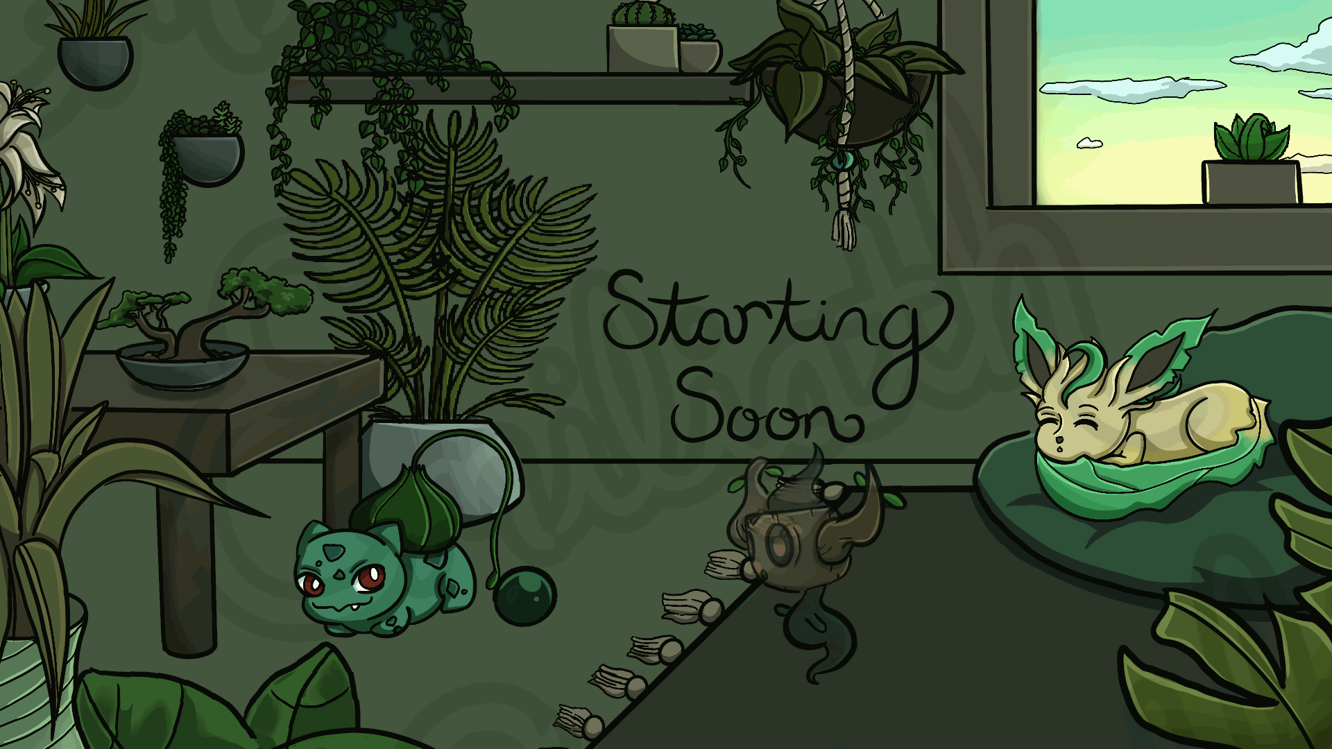 An animated grass pokemon type starting soon screen for your stream, just load the photo into OBS (or wherever you stream from). Watermark will be removed in the download file.